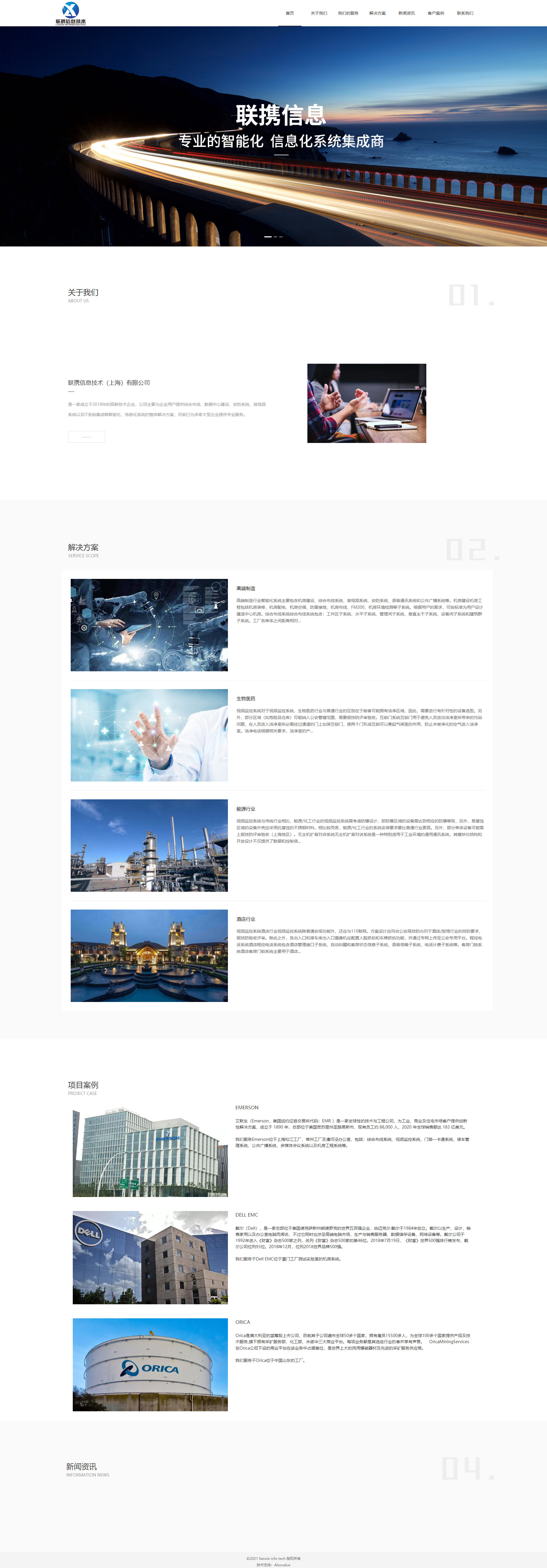 聯(lián)攜信息技術(shù)(上海)有限公司是一家成立于2018年的高新技術(shù)企業(yè),公司主要為企業(yè)用戶提供綜合布線、數(shù)據(jù)中心建設(shè)、安防系統(tǒng)、音視頻系統(tǒng)以及IT系統(tǒng)集成等信息化系統(tǒng)的整體解決方案,目前已為多家大型企業(yè)提供服務。作為一家系統(tǒng)集成商,憑借多年的經(jīng)驗積累,依靠對行業(yè)的深刻理解,我們?yōu)榭蛻籼峁┬袠I(yè)定制解決方案,從項目的前期規(guī)劃、方案設(shè)計、招標咨詢、深化設(shè)計到項目實施、技術(shù)培訓、項目維保,為用戶提供服務。